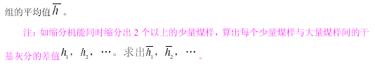 A1 首先將煤樣混勻后縮分為兩部分(或縮分出兩部分),然后,再分別把每一部分當作一個煤樣單獨處理,以得到兩個分析煤樣。分別化驗這兩個分析煤樣的水分、灰分,算出干基灰分,并求出兩者干基灰分的差值(h)。